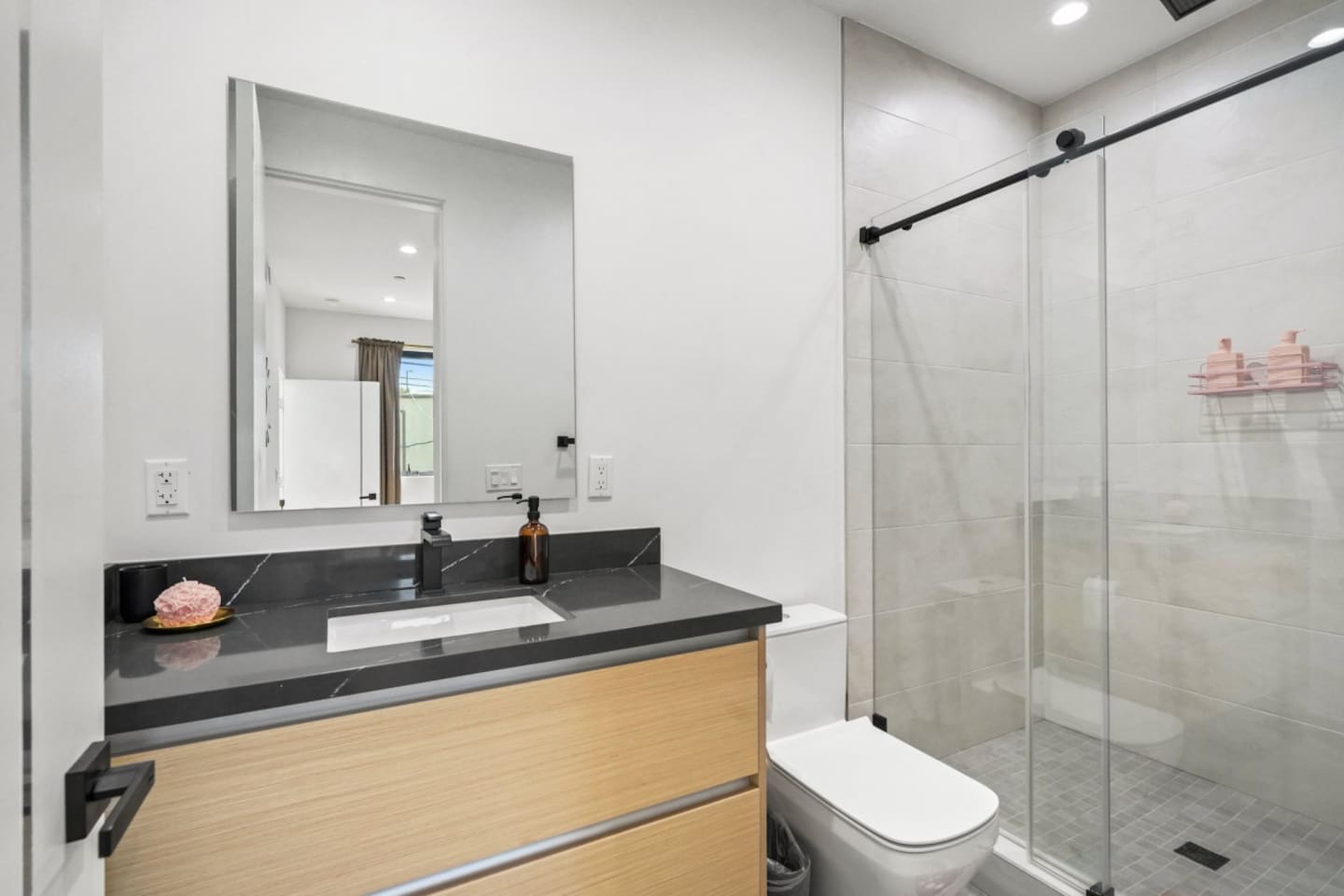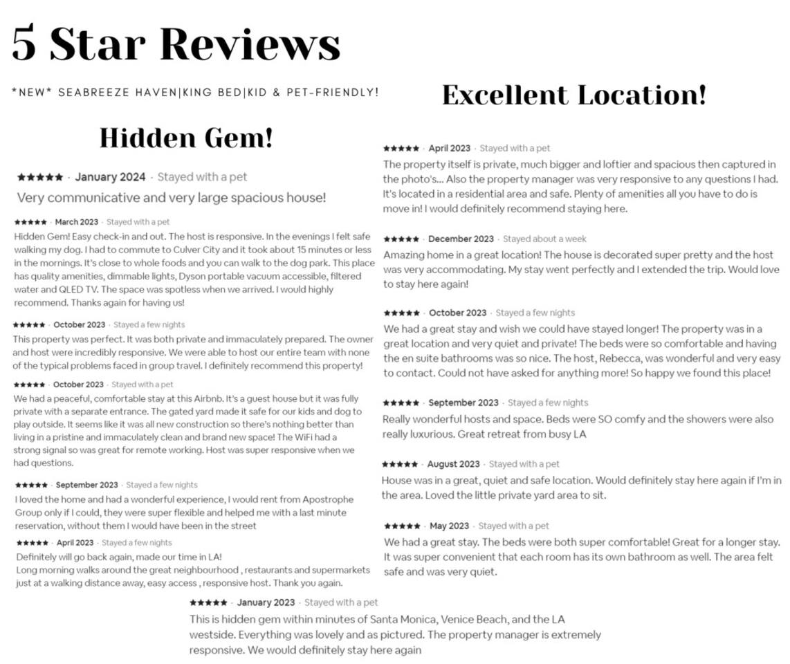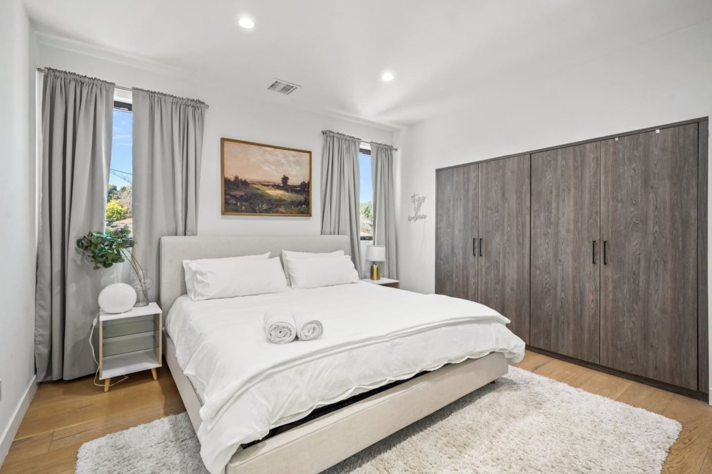 ✓ The Space ✓ Downstairs: Bright open-concept living room, dining area for 6, and fully equipped modern kitchen with marble countertops, walnut cabinets, and high-end appliances—ideal for cooking and gathering. ✓ Upstairs: Quiet private bedrooms and dedicated workspace with natural light—perfect for restful sleep and productive remote work. ✓ Bedrooms: Master Suite: Plush king bed, mounted Smart TV, hotel-quality linens, large wardrobe, and private en-suite bathroom Bedroom 2: Comfortable queen bed, blackout curtains for deep sleep, premium linens, and built-in closet ✓ Bathrooms: • Master en-suite: Luxurious rainfall shower with dual heads, marble finishes • Second full bathroom: Spacious rainfall shower, modern fixtures • Main-level powder room: Convenient half bath for guests Fresh plush towels, premium toiletries, and hair dryer provided ✓ Fully Equipped Kitchen: Cook like home with stainless steel appliances, 5-burner gas stove, large fridge, microwave, toaster, SMEG coffee maker, kettle, quality cookware, and ample marble prep space. ✓ Private Outdoor Patio: Fenced patio with cozy seating and string lights—your sunny LA spot for morning coffee, evening relaxation, or pet playtime. ✓ Laptop-Friendly Workspace: Dedicated desk, chair, lightning-fast WiFi + Ethernet, and abundant natural light—perfect for remote work and video calls. ✓ Family & Pet-Friendly Amenities: • Travel crib & high chair (available on request) • Board games for family evenings • Fully fenced yard ideal for pets • Blackout curtains for better sleep • Pet-friendly throughout ✓ Guest Favorites ★ Secure gated private parking (lockable driveway—rare in LA!) ★ King master suite with Smart TV & luxury bedding ★ 2.5 bathrooms with rainfall showers & marble finishes ★ 75" Samsung Smart TV in living room ★ High-speed WiFi + dedicated workspace ★ Gourmet kitchen with SMEG coffee maker ★ In-unit washer & dryer ★ Pet-friendly fenced patio ★ Kid-friendly extras on request ★ Easy self check-in with keypad